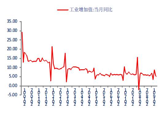 5月份,规模以上工业增加值同比实际增长5.0%,预期增长5.54%,前值增长5.4%。随着出口数据超预期回落,工业增加值数据明显下行,不过本期出口交货值数据偏低也存在被上个月数据透支的情况,不过房地产投资增速下行对于粗钢和水泥产量的负面影响,预计将使工业增加值维持目前的低位。